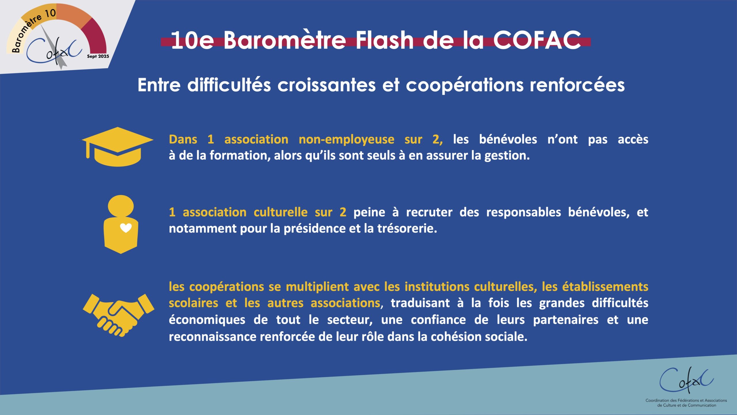 Depuis 2021 le Baromètre Flash de la COFAC mesure la pression sur les dirigeants des associations culturelles afin de mieux comprendre et anticiper leurs besoins. La dernière édition du Baromètre s’est tenue en ligne du 2 septembre au 15 octobre 2025 auprès des responsables d’associations culturelles.